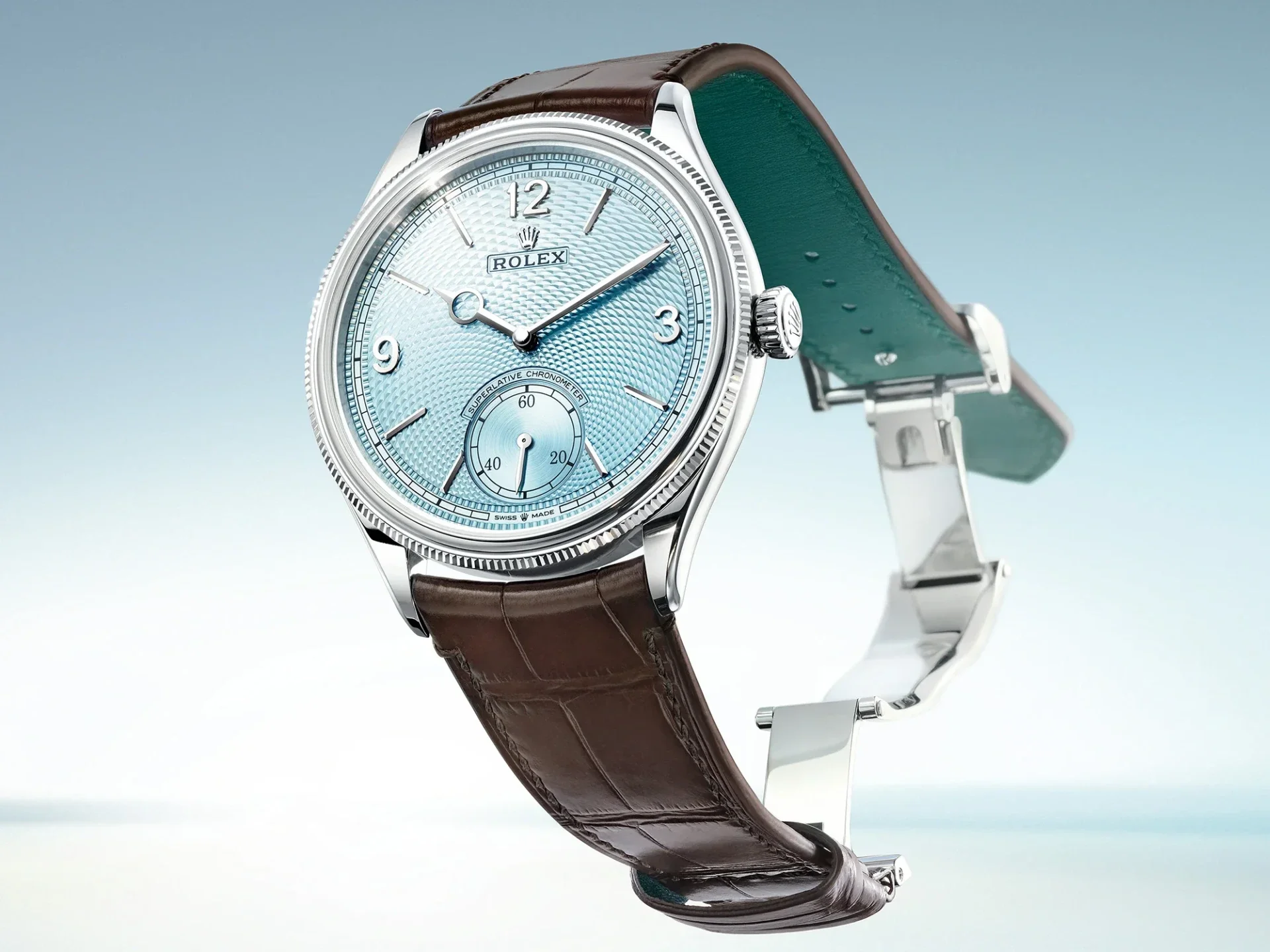 La montre Rolex Perpetual 1908, symbole intemporel de raffinement, revêt désormais une nouvelle allure en platine 950, agrémentée d'un cadran d'un bleu glacier d'une rare élégance, une teinte réservée exclusivement aux pièces façonnées dans ce métal prestigieux. Ce cadran, orné d'un motif grain de riz, interagit subtilement avec la lumière, offrant une palette infinie de reflets à chaque mouvement du poignet. Affirmant sa singularité avec une grâce infinie, cette nouvelle itération de la Perpetual 1908 ne cesse de captiver les regards.